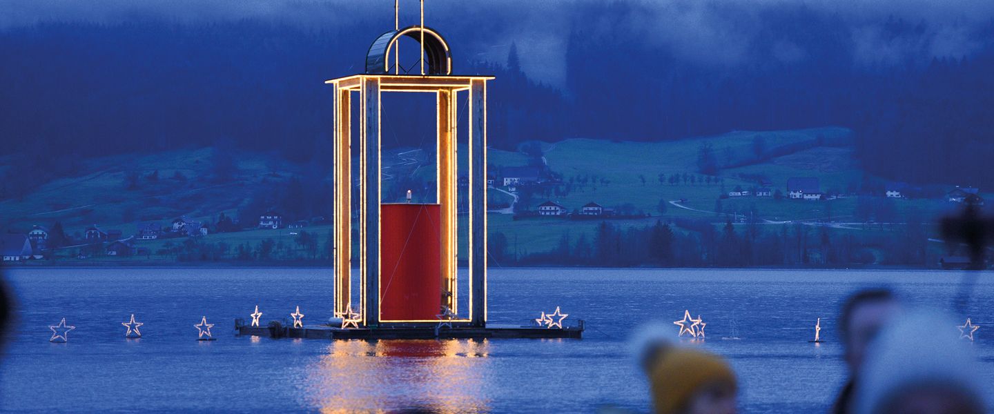Funkelnde Lichter spiegeln sich im tiefblauen Wasser des Wolfgangsees. Erleben Sie einige Attraktionen wie das Friedenslicht im See, Kerzenschein, offene Feuerstellen und traditionelle Klänge.